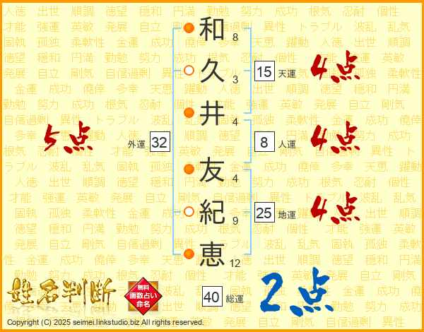 和(8画)久(3画)井(4画) 友(4画)紀(9画)恵(12画)