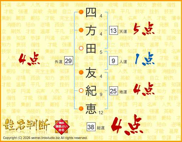 四方田友紀恵さんの総運は38画の4点!