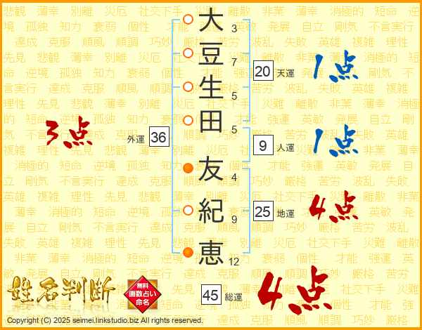 大(3画)豆(7画)生(5画)田(5画) 友(4画)紀(9画)恵(12画)