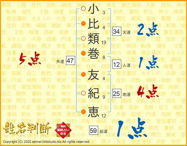 小(3画)比(4画)類(19画)巻(8画) 友(4画)紀(9画)恵(12画)
