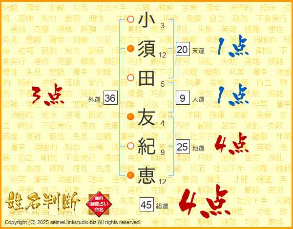 小(3画)須(12画)田(5画) 友(4画)紀(9画)恵(12画)