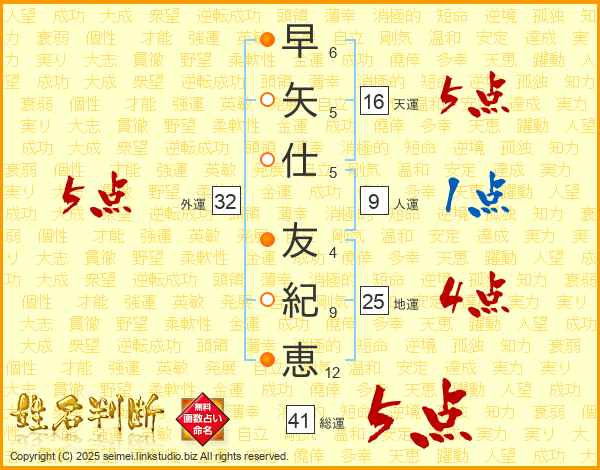 早(6画)矢(5画)仕(5画) 友(4画)紀(9画)恵(12画)