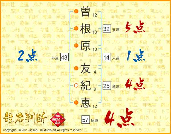 曽(12画)根(10画)原(10画) 友(4画)紀(9画)恵(12画)