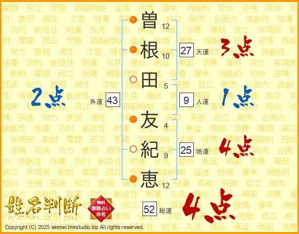 曽(12画)根(10画)田(5画) 友(4画)紀(9画)恵(12画)