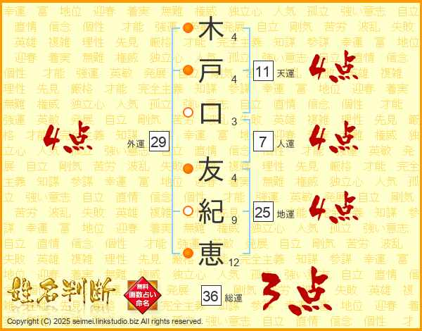 木(4画)戸(4画)口(3画) 友(4画)紀(9画)恵(12画)