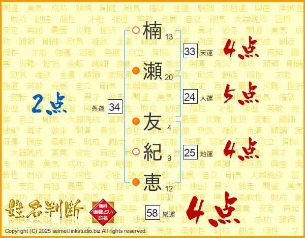 楠(13画)瀬(20画) 友(4画)紀(9画)恵(12画)