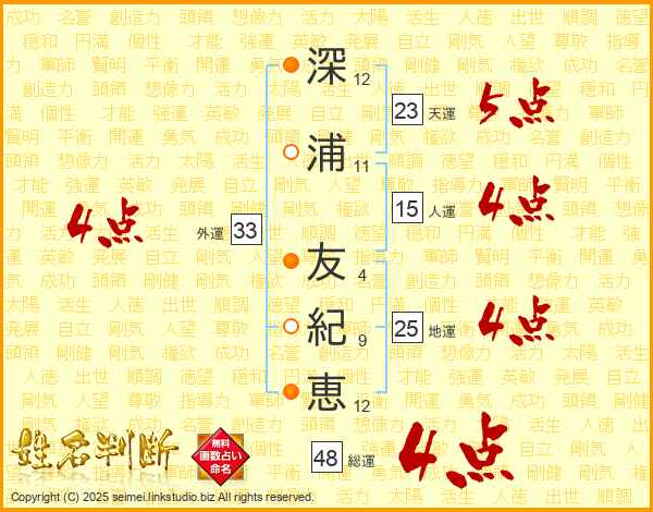 深(12画)浦(11画) 友(4画)紀(9画)恵(12画)
