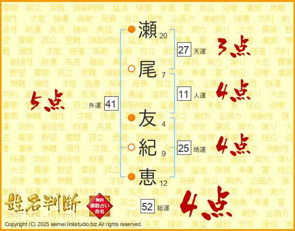 瀬(20画)尾(7画) 友(4画)紀(9画)恵(12画)