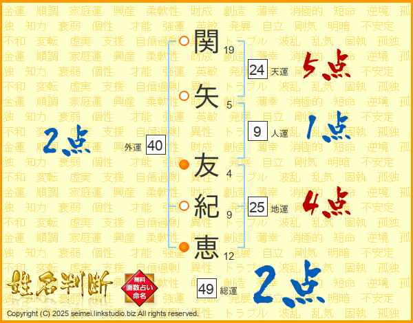 関(19画)矢(5画) 友(4画)紀(9画)恵(12画)
