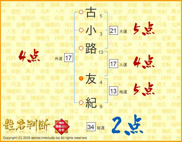 古(5画)小(3画)路(13画) 友(4画)紀(9画)