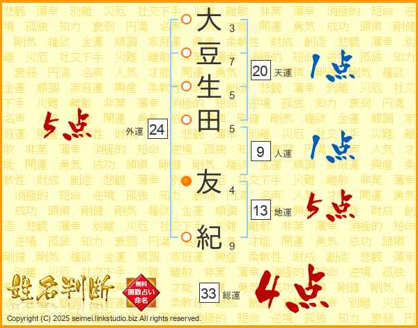 大(3画)豆(7画)生(5画)田(5画) 友(4画)紀(9画)