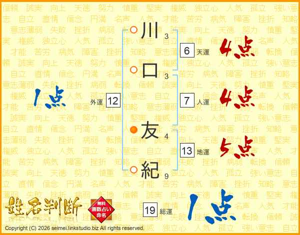 川(3画)口(3画) 友(4画)紀(9画)