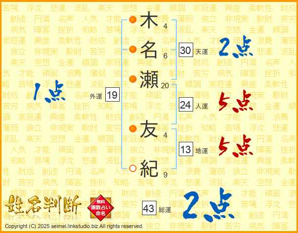 木(4画)名(6画)瀬(20画) 友(4画)紀(9画)