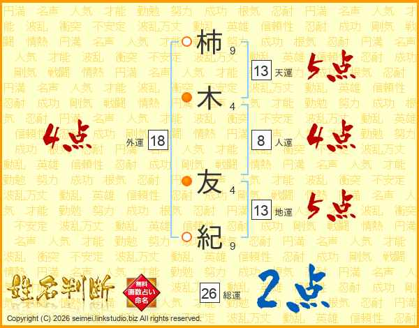 柿(9画)木(4画) 友(4画)紀(9画)