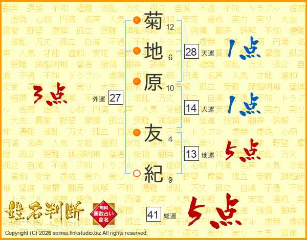 菊地原友紀さんの総運は41画の5点!