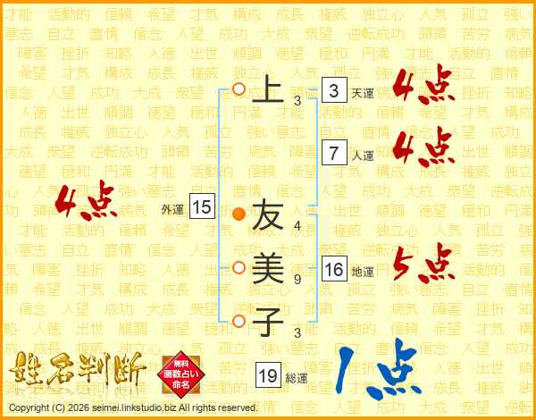生活面を象徴する運勢です。外部から受ける影響力を表し、結婚運、家庭運や職場、環境への順応性を表します。総運から人運を引いた画数。姓や名が1文字の場合を除く。