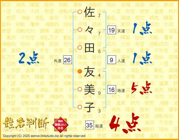 佐(7画)々(7画)田(5画) 友(4画)美(9画)子(3画)