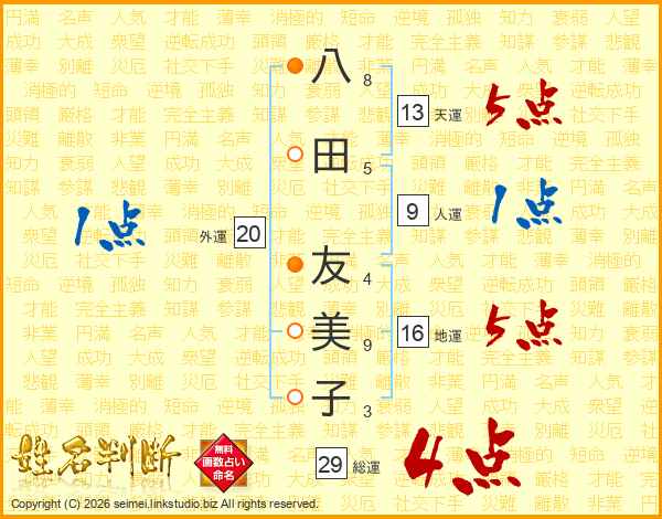 八田友美子さんの天運は13画の5点!