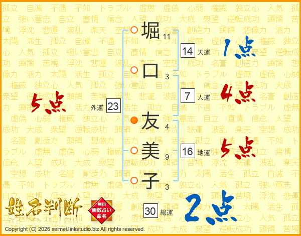 堀(11画)口(3画) 友(4画)美(9画)子(3画)