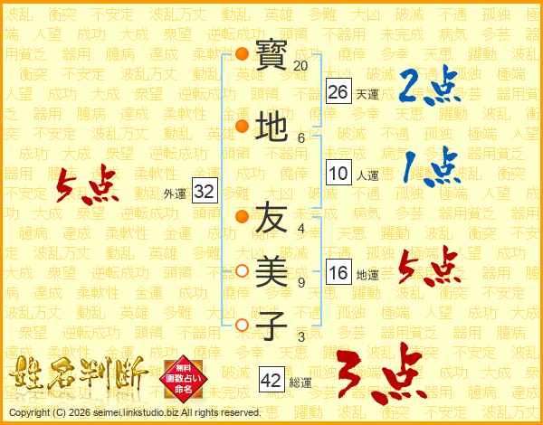 寳(20画)地(6画) 友(4画)美(9画)子(3画)