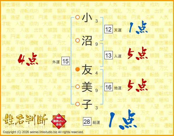 小沼友美子さんの外運は15画の4点!