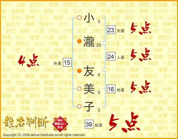 小瀧友美子さんの総運は39画の5点!