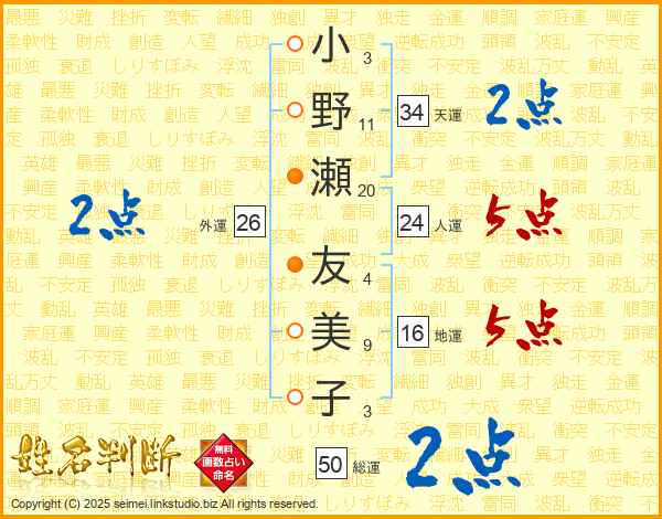 小(3画)野(11画)瀬(20画) 友(4画)美(9画)子(3画)