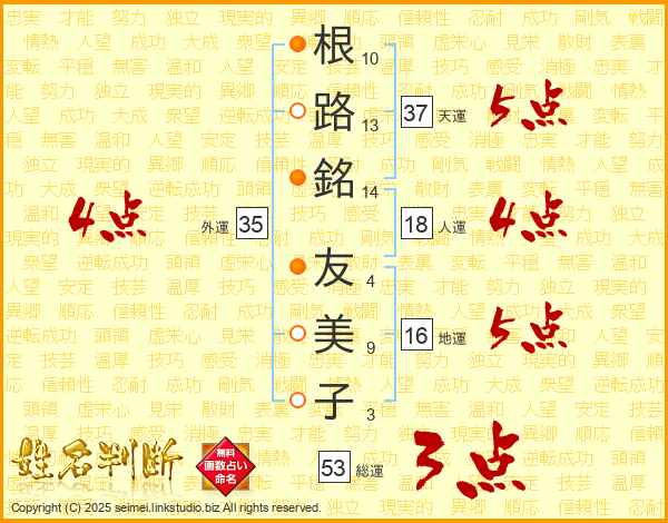 根(10画)路(13画)銘(14画) 友(4画)美(9画)子(3画)