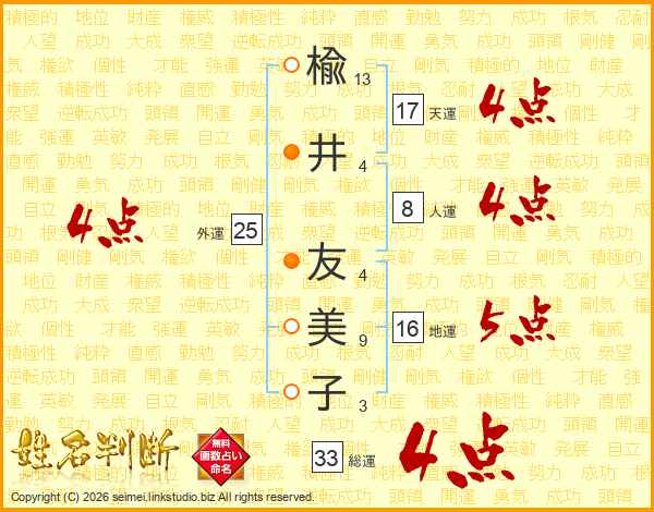 楡(13画)井(4画) 友(4画)美(9画)子(3画)