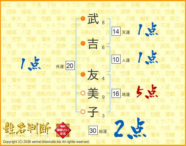 武(8画)吉(6画) 友(4画)美(9画)子(3画)