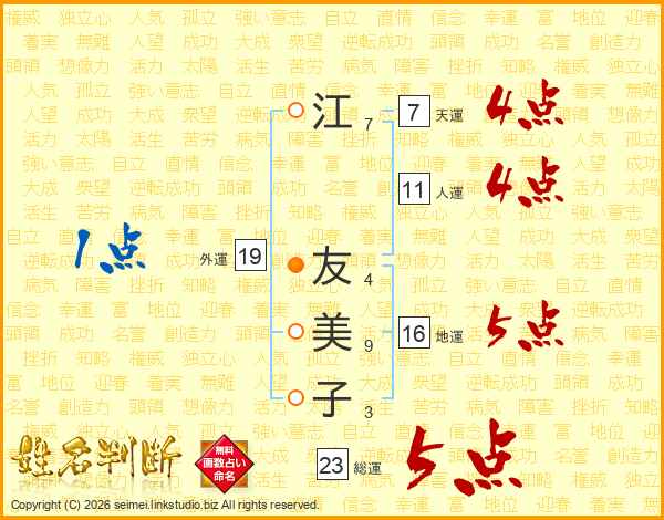 生活面を象徴する運勢です。外部から受ける影響力を表し、結婚運、家庭運や職場、環境への順応性を表します。総運から人運を引いた画数。姓や名が1文字の場合を除く。