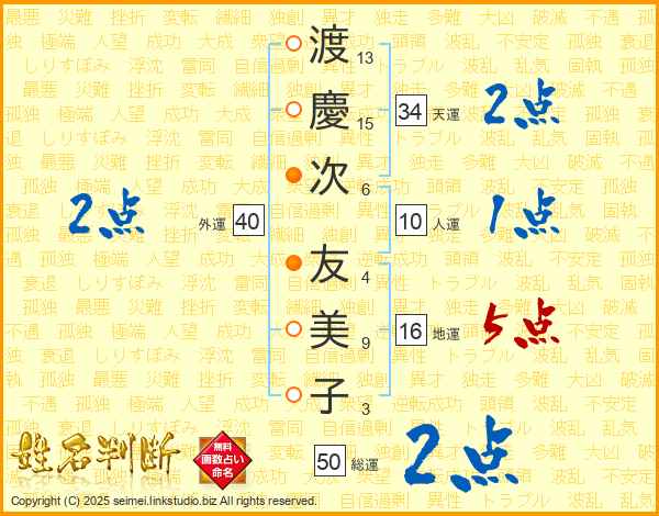 渡(13画)慶(15画)次(6画) 友(4画)美(9画)子(3画)