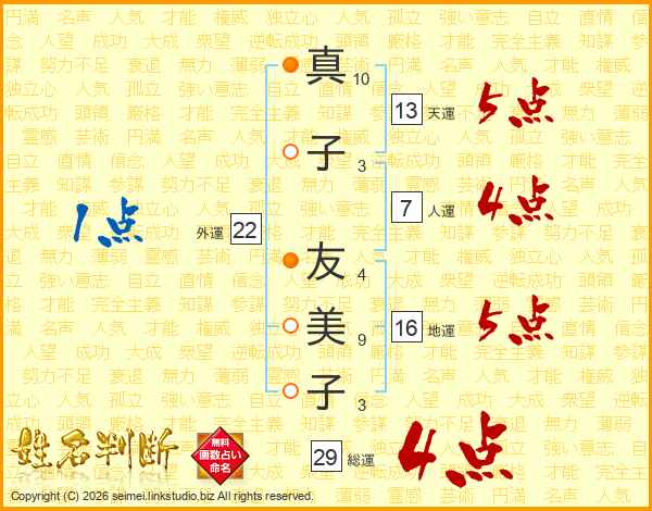 真(10画)子(3画) 友(4画)美(9画)子(3画)