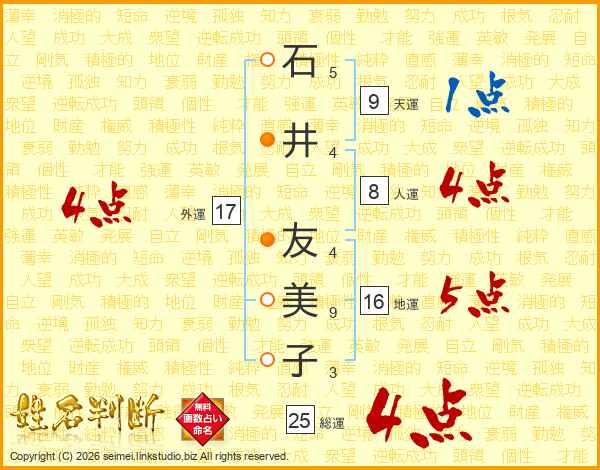 石(5画)井(4画) 友(4画)美(9画)子(3画)