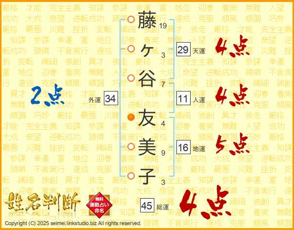 藤(19画)ヶ(3画)谷(7画) 友(4画)美(9画)子(3画)