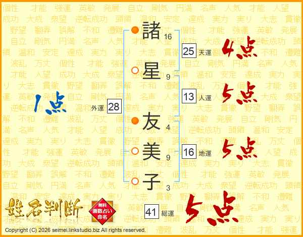 諸(16画)星(9画) 友(4画)美(9画)子(3画)