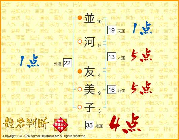 並(10画)河(9画) 友(4画)美(9画)子(3画)