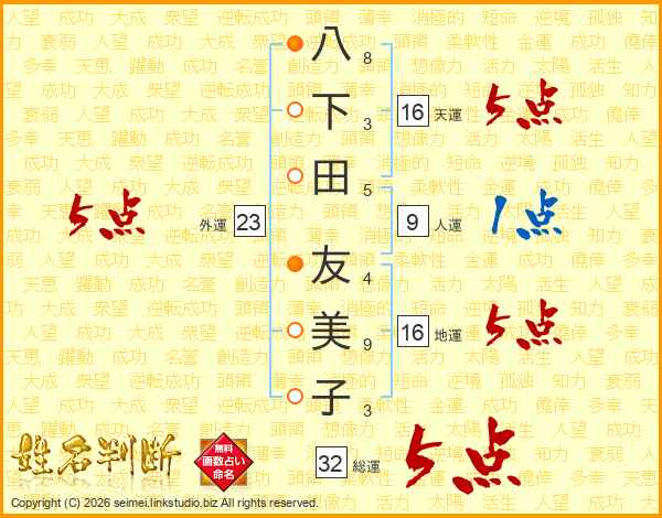 八下田友美子さんの総運は32画の5点!