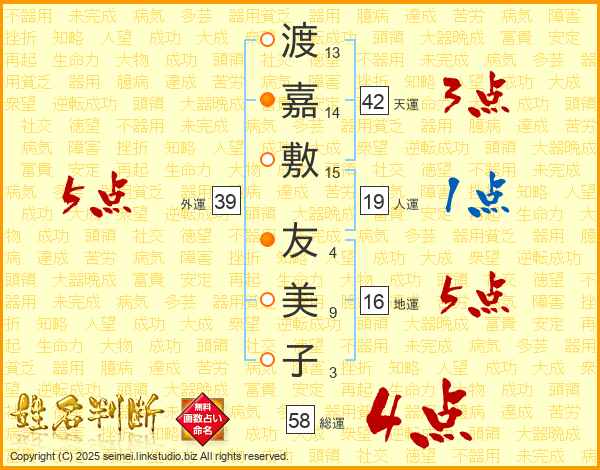 渡(13画)嘉(14画)敷(15画)  友(4画)美(9画)子(3画)