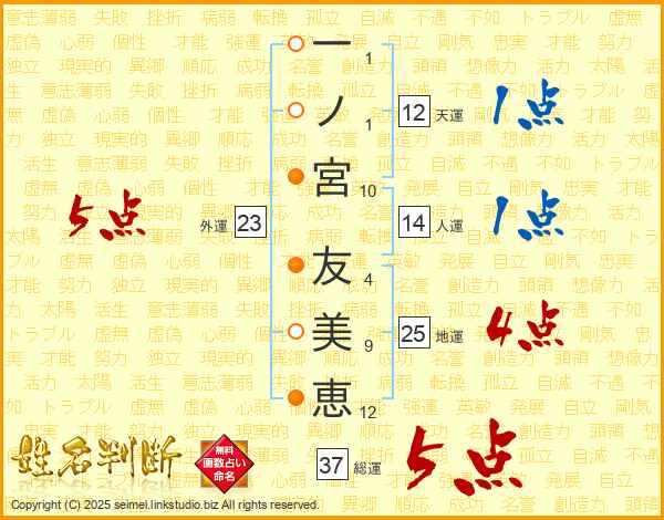 一(1画)ノ(1画)宮(10画) 友(4画)美(9画)恵(12画)