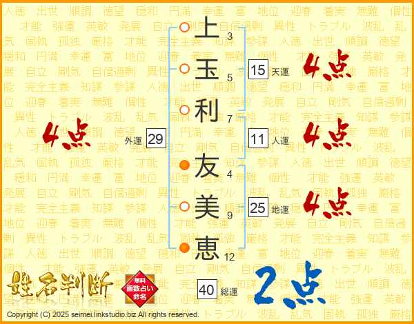 上(3画)玉(5画)利(7画) 友(4画)美(9画)恵(12画)