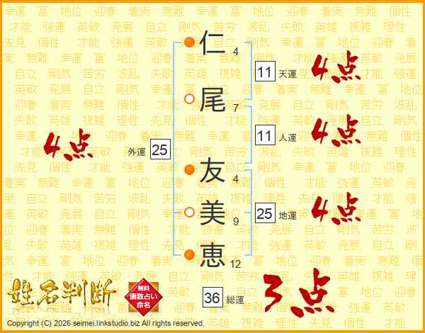 仁(4画)尾(7画) 友(4画)美(9画)恵(12画)