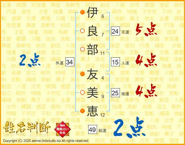 伊(6画)良(7画)部(11画) 友(4画)美(9画)恵(12画)