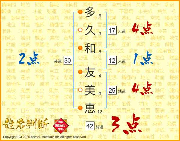 多(6画)久(3画)和(8画) 友(4画)美(9画)恵(12画)