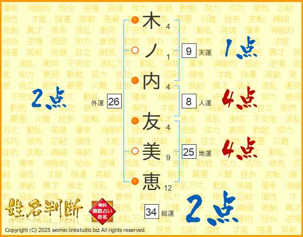 木(4画)ノ(1画)内(4画) 友(4画)美(9画)恵(12画)