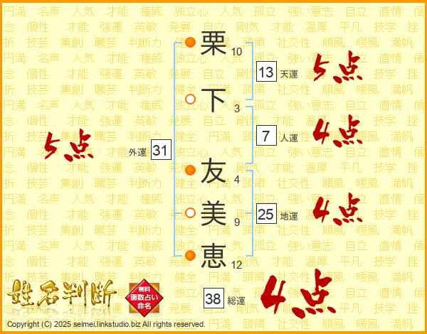 栗(10画)下(3画) 友(4画)美(9画)恵(12画)