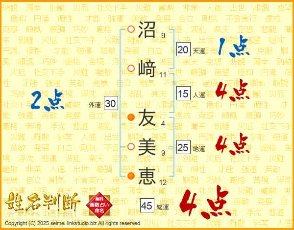 沼(9画)﨑(11画) 友(4画)美(9画)恵(12画)