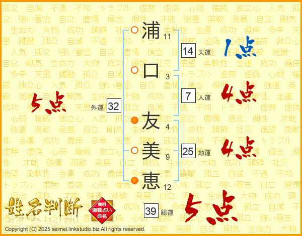 浦口友美恵さんの外運は32画の5点!