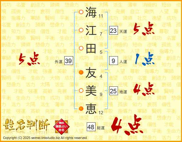 海(11画)江(7画)田(5画) 友(4画)美(9画)恵(12画)