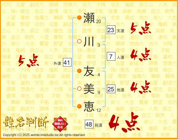 瀬(20画)川(3画) 友(4画)美(9画)恵(12画)